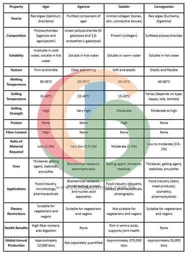 Compositions: Agar is a hydrocolloid with a high gel strength, requiring less quantity than Gelatin.