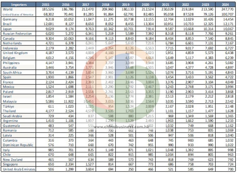 As we see in below chart, total exports of Chinese Dehydrated Garlic (HS Code 07129050) was close to quarter million tons in 2024 with the US being Top importer at 100K+ tons.