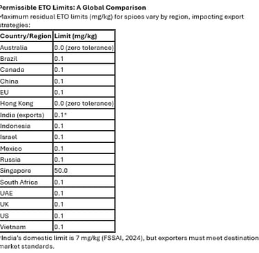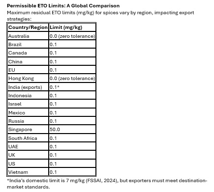 2023–2024: Indian exporters adopted enhanced ETO testing (GC-MS and headspace analysis) to comply with EU/UK limits of 0.1 mg/kg, following rejections of 12% of spice consignments at EU borders (FSSAI, 2024).