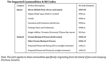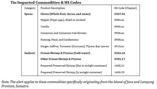 o Scope: Applies to all spice and shrimp shipments from the affected regions, regardless of the specific exporter’s history.